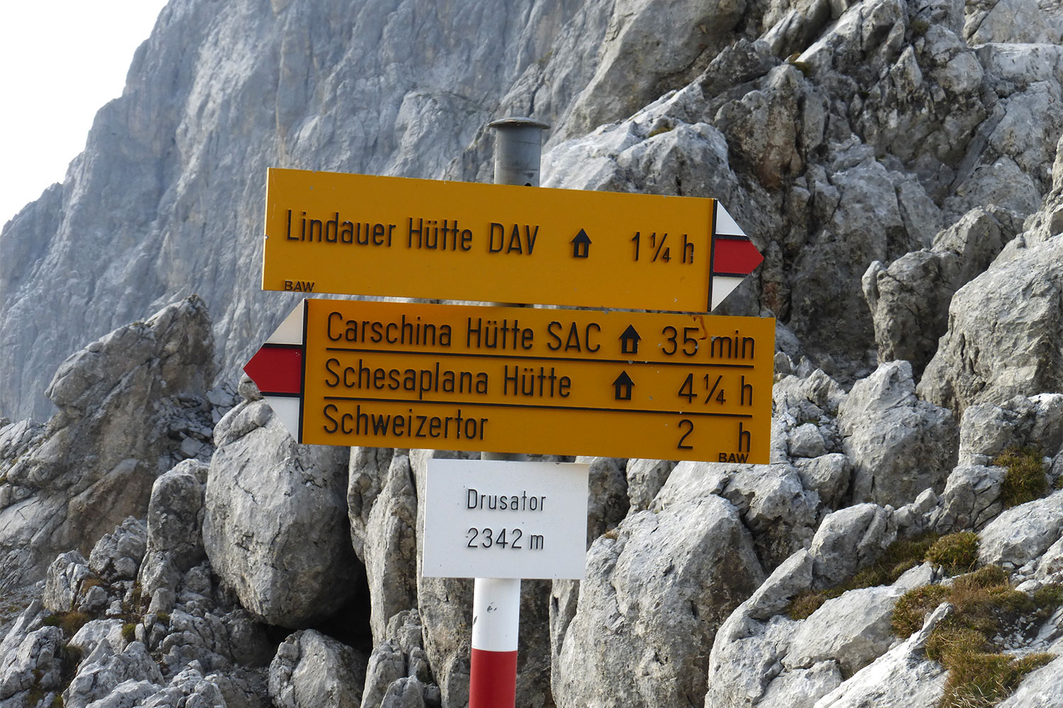 Am Samstag ging es nun bei wolkenlosem Himmel von der Lindauer Hütte durch den „Rachen“ (sehr steile Schutthalde) hinauf zur Sulzfluh (2818 m), einer der 10 höchsten Alpengipfel im Rätikon. Nach einer ausgiebigen Mittagspause am Gipfel sind wir von dort in die Schweiz abgestiegen und über die Carschina-Hütte und das Drusentor zurück zur Lindauer Hütte wieder nach Österreich gewandert.