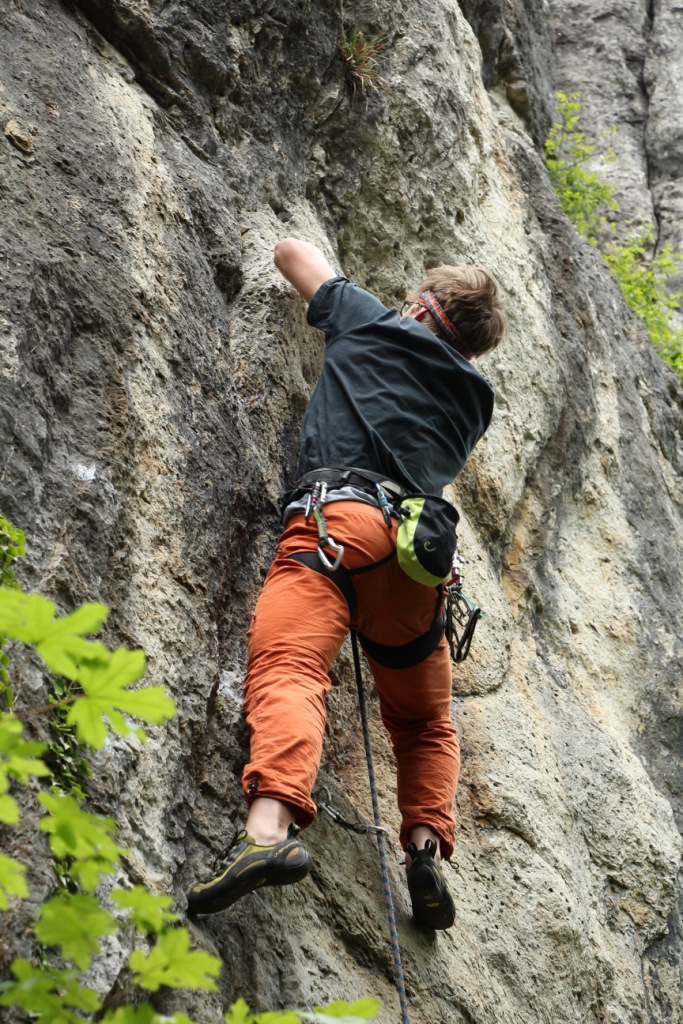 Über Pfingsten fuhren sieben Jugendliche des Suhler Alpenvereins in die Fränkische Schweiz zum beliebten Campingplatz „Oma Eichler“. Einige von uns kletterten das erste Mal am Kalkfelsen und waren erfreut über die ungewohnte Griffigkeit. Es waren drei lustige, ereignisreiche und durchaus bemerkenswerte Tage. Das Wetter war leider nicht ganz auf unserer Seite. Es war zwar, bis auf einen Hagelregen, trocken und zeitweise sonnig, jedoch herrschten gefühlte minus 20 Grad, was das Ausharren am Fels für die nicht Kletternden nicht gerade angenehm machte.
